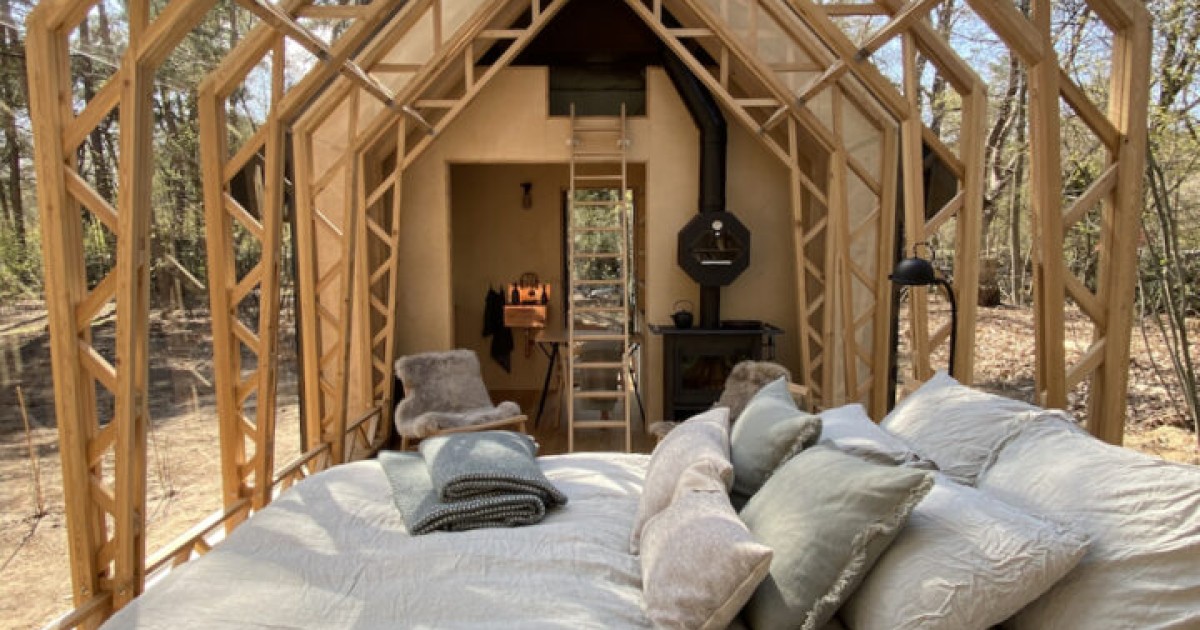 Designer Caspar Schols designed and built the first prototype of Cabin ANNA, inspired by an original cabin he built for his mother. ANNA Origin, with its primitive experience, exudes an authentic charm that makes every overnight stay special. Equipped with a wood-burning stove, a generous bathtub hidden in the floor and a simple but complete and movable kitchenette, the cabin offers a unique and comfortable experience. The toilet and shower are located in separate cottages next to the cabin, adding to its unique charm and connection with nature.